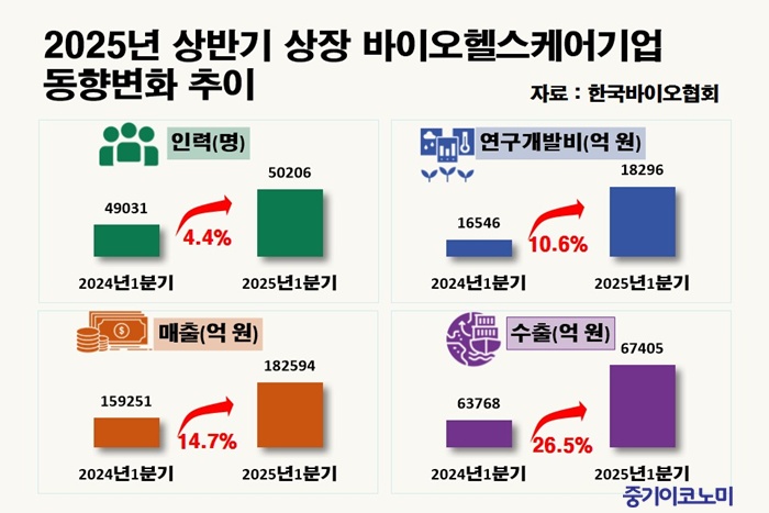 2025³â 2ºÐ±â ¹ÙÀÌ¿ÀÇコÄÉ¾î ±â¾÷ÀÇ ¸ÅÃâÀº Àü³â µ¿±â ´ëºñ 14.3% Áõ°¡Çß´Ù. ÀǾàǰ ºÐ¾ß°¡ 15.4%, ÀÇ·á±â±â ºÐ¾ß°¡ 4.9% ¼ºÀåÇßÀ¸¸ç, ³»¼ö(7%)º¸´Ù ¼öÃâ(24.1%)ÀÇ Áõ°¡ÆøÀÌ ¾à 3¹è ³ô¾Æ ¼öÃâÀÌ ¸ÅÃâ ¼ºÀåÀÇ ÇÙ½É ¿äÀÎÀ¸·Î ÀÛ¿ëÇß´Ù.