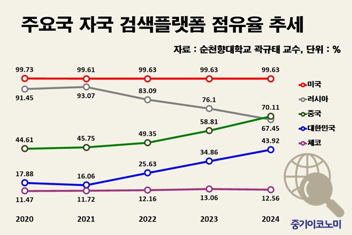 °û ±³¼ö´Â ¡°2024³â ±âÁØ ÀÚ±¹ °Ë»ö¿£ÁøÀ» º¸À¯ÇÑ ±¹°¡´Â Àü ¼¼°è 7°³±¹¿¡ ºÒ°úÇÏ´Ù¡±¸ç ¡°Çѱ¹Àº ¹Ì±¹¡¤Áß±¹¡¤·¯½Ã¾Æ¿¡ À̾î 4À§¸¦ Â÷ÁöÇß´Ù¡±°í ¹àÇû´Ù. ¶Ç ¸ð¹ÙÀÏ ¾Û ½ÃÀå¿¡¼µµ Çѱ¹Àº ¼¼°è 3À§ ¼öÁØÀ» ±â·ÏÇØ ÀÚ±¹ Ç÷§Æû °æÀï·ÂÀÌ ¿©ÀüÈ÷ °ÇÑ ±¹°¡ÀÓÀ» º¸¿©Áá´Ù.