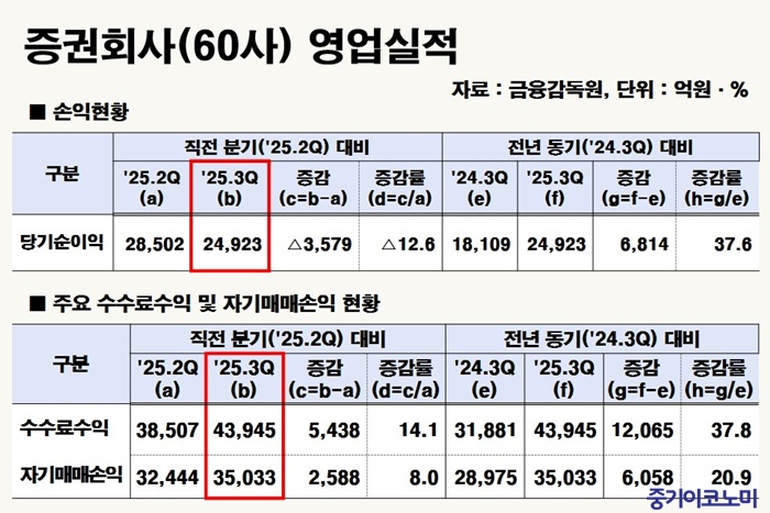 ±ÝÀ¶°¨µ¶¿øÀÌ 3ÀÏ ¹ßÇ¥ÇÑ ¡®2025³â 3ºÐ±â Áõ±Ç¡¤¼±¹°È¸»ç ¿µ¾÷½ÇÀû(ÀáÁ¤)¡¯¿¡ µû¸£¸é, Áõ±Ç»ç 60°÷ÀÇ 3ºÐ±â ¼øÀÌÀÍÀº 2Á¶4923¾ï ¿øÀ¸·Î Áý°èµÆ´Ù. ÀÌ´Â ÀüºÐ±â 2Á¶8502¾ï ¿ø ´ëºñ 12.6%(3579¾ï ¿ø) °¨¼ÒÇÑ ¼öÄ¡´Ù. ´Ù¸¸ Àü³â µ¿±â ´ëºñ·Î´Â 37.6%(6814¾ï ¿ø) Áõ°¡ÇÏ¸ç ¼ºÀå È帧À» À¯ÁöÇß´Ù.