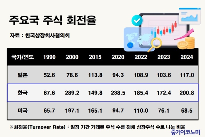¿ùµå¹ðÅ© Åë°è¿¡ µû¸£¸é, Çѱ¹ °³ÀÎÁÖÁÖÀÇ Æò±Õ ÁÖ½Ä º¸À¯±â°£Àº ¾à 3~6°³¿ù·Î Á¶»çµÆ´Ù. ƯÈ÷ 2020³â ÀÌÈÄ °³ÀÎÅõÀÚÀÚ À¯ÀÔÀÌ ÆøÁõÇϸ鼭 Æò±Õ ÁÖ½Ä º¸À¯±â°£ÀÌ ÄÚ½ºÇÇ 2.7°³¿ù, ÄÚ½º´Ú 1.1°³¿ù±îÁö ´ÜÃàµÇ´Â µî ´Ü±â¸Å¸Å°¡ ´õ¿í È®´ëµÇ´Â »óȲÀÌ´Ù. 2024³â ±âÁØ Çѱ¹ÀÇ ÁֽĽÃÀå ȸÀüÀ²Àº 200.8·Î ¹Ì±¹(68.5)ÀÇ ¾à 3¹è, ÀϺ»(117.0)ÀÇ 1.7¹è¿¡ ´ÞÇÑ´Ù. ȸÀüÀ²Àº ÀÏÁ¤ ±â°£ °Å·¡µÈ ÁÖ½Ä ¼ö¸¦ Àüü »óÀåÁÖ½Ä ¼ö·Î ³ª´« ºñÀ²À» ¸»ÇÑ´Ù.