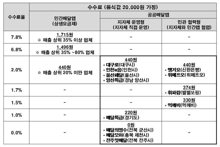 ±¹È¸ÀÔ¹ýÁ¶»çó°¡ ÃÖ±Ù ¹ß°£ÇÑ ¡®°øÀÍ ±â´É Å« °ø°ø¹è´Þ¾ÛÀÇ °æÀï·Â Á¦°í ¹æ¾È¡¯ º¸°í¼¿¡ µû¸£¸é, ¹Î°£¹è´Þ¾ÛÀÇ ¼ö¼ö·áÀ²ÀÌ ÃÖ´ë 7.8%¿¡ ´ÞÇÏ´Â ¹Ý¸é, °ø°ø¹è´Þ¾ÛÀº 0~2% ¼öÁØ¿¡ ¸Ó¹«¸£¸ç ¼ö¼ö·á Àý°¨ È¿°ú°¡ È®¿¬Çß´Ù. 2¸¸¿ø »ó´çÀÇ À½½ÄÀ» ÁÖ¹®ÇÒ °æ¿ì ¹Î°£¹è´Þ¾Û¿¡¼´Â ºÎ°¡¼¼ Æ÷ÇÔ ÃÖ°í 1715¿øÀÌ ºÎ°úµÇÁö¸¸, »ó´ç¼ö °ø°ø¹è´Þ¾Û¿¡¼´Â 440¿ø¿¡ ºÒ°úÇÏ´Ù. °æ±âµµÀÇ ¡®¹è´ÞƯ±Þ¡¯Ã³·³ 220¿ø¸¸ ºÎ°úÇÏ´Â »ç·Êµµ ÀÖÀ¸¸ç, ±º»ê½Ã ¡®¹è´ÞÀǸí¼ö¡¯Ã³·³ ¿ÏÀü ¹«·áÀÎ °æ¿ìµµ ÀÖ´Ù.