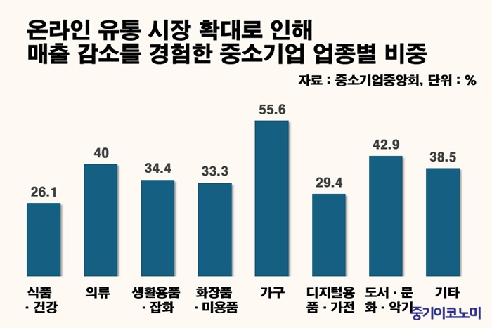 ¹®Á¦´Â ¿Â¶óÀÎ ½ÃÀå È®´ë¿¡ µû¸¥ ¸ÅÃâ °¨¼Ò¿´´Ù. ´ëÇü¸¶Æ® ÀÔÁ¡ ±â¾÷ÀÇ 37.5%°¡ ¡°2024³â ¸ÅÃâÀÌ Àü³âº¸´Ù ÁÙ¾ú´Ù¡±°í ´äÇßÀ¸¸ç, ±×Áß 29.5%´Â ¿øÀÎÀ¸·Î ¡®¿Â¶óÀÎ À¯Åë ¼ºÀ塯À» Áö¸ñÇß´Ù. »ýȰ¿ëǰ¡¤ÀâÈ ¾÷üÀÇ °æ¿ì 34.4%°¡ ¿Â¶óÀÎ È®ÀåÀ¸·Î ¸ÅÃâÀÌ °¨¼ÒÇß´Ù°í ÀÀ´äÇØ °¡Àå Å« Ÿ°ÝÀ» ¹Þ¾Ò´Ù.