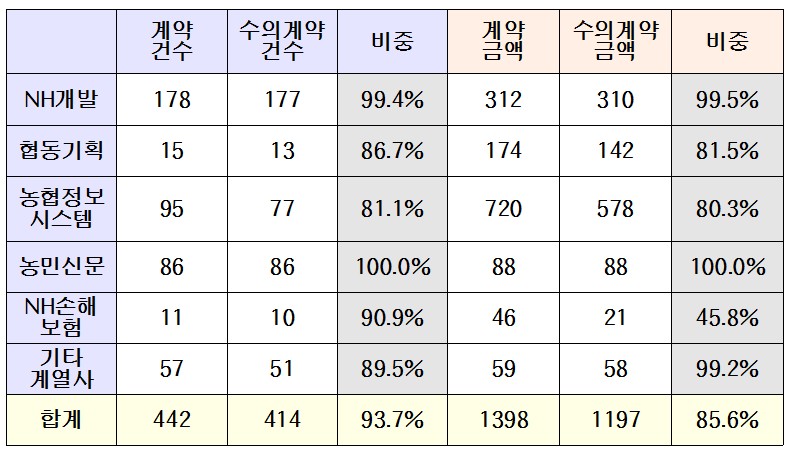 ƯÈ÷ 442°ÇÀÇ °è¾à °¡¿îµ¥ 385°Ç(87%) 1339¾ï(95.8%)Àº NH°³¹ß, Çùµ¿±âȹ(NH°³¹ß ÀÚȸ»ç), ³óÇùÁ¤º¸½Ã½ºÅÛ, ³ó¹Î½Å¹®, NH¼ÕÇØº¸Çè 5°³ °è¿­»ç¿¡ ÁýÁßµÆ´Ù°í ¹Î ÀÇ¿øÀº ¹àÇû´Ù.