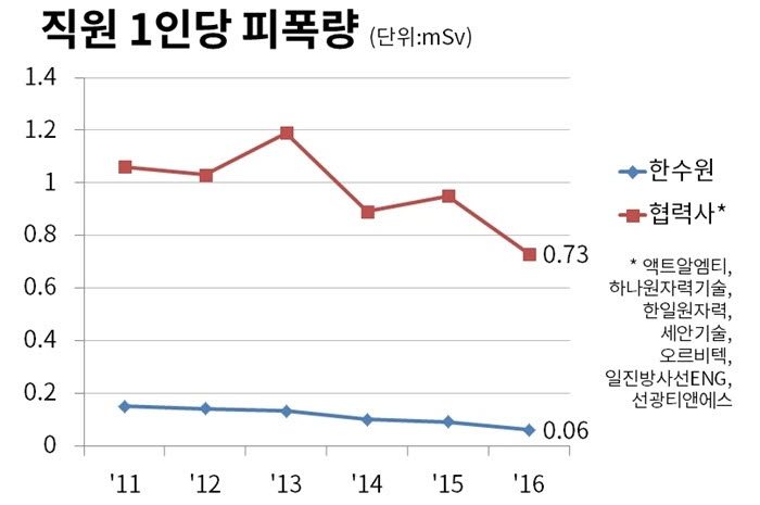 ÇѼö¿ø Á¤±ÔÁ÷ÀÇ 1ÀÎ´ç Æò±Õ ÇÇÆø·®Àº 2011³â 0.15mSv¿¡¼ ¿ÃÇØ´Â 0.06mSv·Î °¨¼ÒÇß´Ù. ¿ë¿ª¾÷ü Á÷¿ø ÇÇÆø·®µµ 1.06mSv¿¡¼ 0.73mSv·Î °¨¼ÒÇϱâ´Â ÇßÀ¸³ª, ¸Å³â Áõ°¨À» ¹Ýº¹ÇÏ´Â ½ÇÁ¤ÀÌ´Ù.
