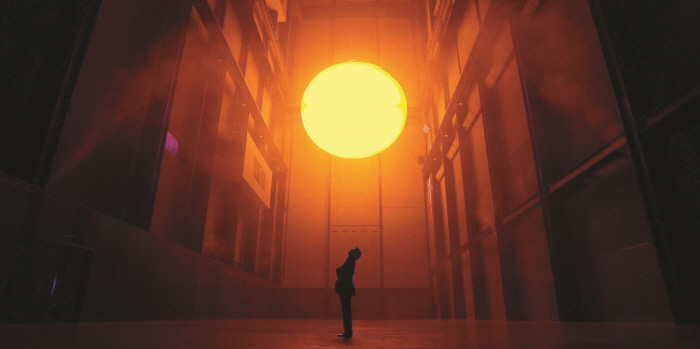 ±× ´ç½Ã Åͺó Ȧ¿¡´Â ·±´øÀÇ ¾È°³Ã³·³ ÀÚ¿íÇÑ ¼öÁõ±â°¡ °ø°£À» ä¿ì°í, 200°³ÀÇ ¼Òµã·¥ÇÁ¸¦ ǰ°í ÀÖ´Â Áö¸§ 15mÀÇ ¹Ý¿øÇü öÁ¦ ÇÁ·¹ÀÓÀÌ ÃµÀå¿¡ ¼³Ä¡µÈ °Å¿ï¿¡ ÀÇÇØ ¿ÏÀüÇÑ ¿øÇüÀ» ÀÌ·ç¸ç À̱۰Ÿ®´Â žçÀÇ ¸ð½ÀÀ¸·Î ºûÀ» »Õ°í ÀÖ¾ú´Ù. ½Ç·Î ÀÌ Àΰø Å¾çÀº À¯»ç ÀÚ¿¬ÀÇ °áÁ¤ÆÇÀ̾ú´Ù. ¡®³¯¾¾ ÇÁ·ÎÁ§Æ®(The Weather Project)¡¯¶ó ¸í¸íµÈ ÀÌ Àü½Ãȸ°¡ ¿·È´ø Åͺó ȦÀº Àΰø Å¾çÀ» ´À³¢±â À§ÇÑ °ü¶÷°´À¸·Î Ç×»ó ºÏÀû°Å·È´Ù. ±×°÷Àº ÀÌ¹Ì °Å´ëÇÑ Àϱ¤¿åÀåÀ¸·Î º¯¸ðÇØ ÀÖ¾ú´Ù.
