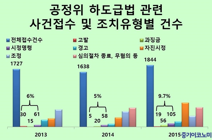 2013~2015³â±îÁö ¿¬Æò±Õ 1736°ÇÀÇ Çϵµ±Þ¹ý À§¹Ý ½Å°í»ç°Ç¿¡ ´ëÇØ °øÁ¤°Å·¡À§¿øÈ¸°¡ °í¹ßÁ¶Ä¡¡¤°ú¡±Ý¡¤½ÃÁ¤¸í·É µî ½ÇÁúÀûÀÎ Á¦ÀçóºÐÀ» ³»¸° °Ç¼ö´Â ¿¬Æò±Õ 123°Ç(7.1%)¿¡ ºÒ°úÇß´Ù. ¹Ý¸é ¼¸é°æ°í °Ç¼ö´Â 2014³â 172°Ç¿¡¼ 2015³â 600¿©°ÇÀ¸·Î ±ÞÁõÇÑ °ÍÀ¸·Î ³ªÅ¸³ª Çϵµ±Þ¹ý À§¹Ý ¹üÁË¿¡ ´ëÇÑ °øÁ¤À§ÀÇ ¡®¸éÁ˺Π¼ö»ç¡¯¶õ ºñÆÇ°ú ÇÔ²² ¡®¼Ø¹æ¸ÁÀÌ Ã³¹ú¡¯ ³í¶õÀ» ÇÇÇÒ ¼ö ¾ø°Ô µÆ´Ù.