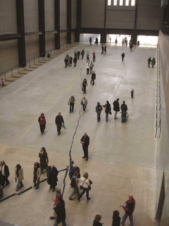 »ì¼¼µµ´Â 2007³â ¿µ±¹ÀÇ Å×ÀÌÆ®¸ð´ø ¹Ì¼ú°ü ÅͺóȦ(Turbin Hall)¿¡ ´ëÁöÁøÀÇ ÈçÀûÀ» Àü½ÃÇß´Ù. ÅͺóȦ ÀÔ±¸¿¡¼ ¹Ì¼¼ÇÏ°Ô ½ÃÀÛÇÏ´Â ÄÜÅ©¸®Æ® Àü½ÃÀå ¹Ù´ÚÀÇ ÀÛÀº ±ÝÀº Á¡Â÷ ±í°í ³Ð¾îÁö¸ç Áö±×Àç±×·Î Ã౸À庸´Ùµµ ´õ ±ä ÅͺóȦÀ» °¥¶ó³õ¾Ò´Ù. ¸¶Ä¡ ÁøÂ¥ ÁöÁøÀÌ ÀϾ¼ ¹Ù´ÚÀÌ °¥¶óÁø °Íó·³ º¸ÀÌ´Â ÀÌ °Å´ëÇÑ ±Õ¿ ÀÛ¾÷Àº ÀÛ°¡ÀÇ °èȹ ¾Æ·¡¿¡¼ ÀΰøÀûÀ¸·Î ¸¸µé¾îÁø ¼³Ä¡ÀÛ¾÷ÀÌ´Ù.