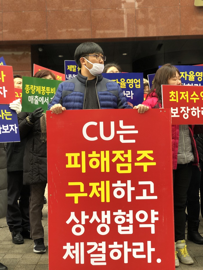 CUÁ¡Æ÷°³¼³ÇÇÇØÀÚ¸ðÀÓ¡¤CU»ó»ýÇù¾àºñ»ó´ëÃ¥À§¿øÈ¸¡¤Àü±¹°¡¸ÍÁ¡ÁÖÇùÀÇȸ¡¤Âü¿©¿¬´ë ¹Î»ýÈñ¸Áº»ºÎ¡¤¹Îº¯ ¹Î»ý°æÁ¦À§¿øÈ¸ µîÀº 29ÀÏ ¼¿ï½Ã °³²±¸ »ï¼ºµ¿ BGF¸®Å×ÀÏ »ç¿Á ¾Õ¿¡¼ ±âÀÚȸ°ßÀ» ¿°í, ¡°CUÁ¡ÁÖµéÀº Áö³ 8¿ù21ÀÏ ÆíÀÇÁ¡»ê¾÷Çùȸ ¾Õ¿¡¼ ÁøÇàÇÑ ±âÀÚȸ°ßÀ» ½ÃÀÛÀ¸·Î 3°³¿ù¿©°£ »ê¾÷Çùȸ¿Í º»»ç ¾ÕÀ» ¿À°¡¸ç Àú¸ÅÃâ ÇÇÇØÁ¡Æ÷ ±¸Á¦¿Í Á¦µµ°³¼±À» ¿ä±¸ÇØ ¿Ô´Ù¡±¸ç ¡°±×·¯³ª º»»ç´Â 10¿ù ±¹Á¤°¨»ç¿¡¼¸¸ Àá½Ã Á¡ÁÖµéÀÇ ¿ä±¸¿¡ ±Í¸¦ ±â¿ïÀÌ´Â µíÇÑ ¸ð½ÀÀ» º¸¿´À» »Ó ¼Ò±ØÀû ŵµ·Î ÀϰüÇß´Ù¡±°í ºñ³Çß´Ù.