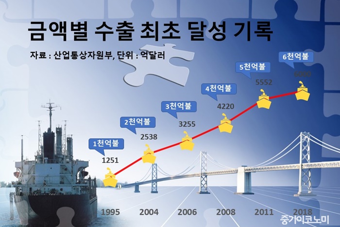 »ê¾÷Åë»óÀÚ¿øºÎ¿Í °ü¼¼Ã»¿¡ µû¸£¸é, ¼öÃâ 6000¾ï ´Þ·¯ ±â·ÏÀº 1948³â ¼öÃâÀÌ ½ÃÀÛµÈ ÀÌ·¡ 70³â ¸¸¿¡ ´Þ¼ºÇÑ ¼º°úÀ̸ç, 2011³â ¼öÃâ 5000¾ï ´Þ·¯ ´Þ¼º ÀÌÈÄ 7³â ¸¸¿¡ ¿ª´ë ÃÖ´ë ¼öÃâ ½ÇÀûÀÌ´Ù.