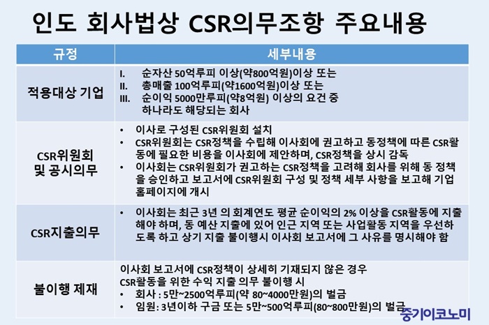 ÃÖ±Ù Àü¼¼°è ÁÖ¿ä ±¹°¡µéÀº ±â¾÷ÀÇ »çȸÀûÃ¥ÀÓ(CSR)À» ¸í½ÃÀûÀ¸·Î Á¦µµÈÇÏ´Â µî ¿©·¯ ¹æ¹ýÀ» ÅëÇØ CSRÀ» °ÈÇÏ´Â Ãß¼¼´Ù. ÀεµÀÇ °æ¿ì 2014³â CSR Ȱµ¿À» ¹ýÁ¦ÈÇßÀ¸¸ç, ¿ÃÇØ 7¿ùºÎÅÍ CSR Àǹ«¿Í °ü·ÃµÈ ó¹úÁ¶Ç×À» ´ã¾Ò´Ù. ÀÌ¿¡µû¶ó Àεµ¿¡ ÁøÃâÇ߰ųª ÁøÃâÇÏ·Á´Â ±â¾÷Àº À̸¦ ¹Ì¸® ÆÄ¾ÇÇÏ°í ´ëÀÀÇÒ ¼ö ÀÖ´Â ¹æ¾ÈÀ» ã¾Æ¾ß ÇÑ´Ù.