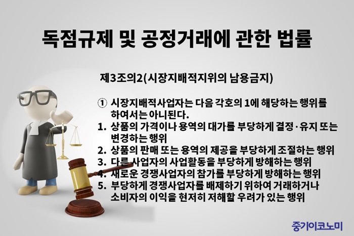 °øÁ¤°Å·¡¹ý Á¦3Á¶ÀÇ2´Â 5°¡Áö ½ÃÀåÁö¹èÀû ÁöÀ§³²¿ë ÇàÀ§¸¸À» ±ÝÁöÇÑ´Ù. ±è º¯È£»ç´Â ½ÃÀåÁö¹èÀû ÁöÀ§³²¿ëÀº ´Ù¾çÇÏ°Ô ¹ß»ýÇϰí, Çö½Ç¿¡¼ ¹ú¾îÁö´Â ½ÃÀåÁö¹èÀû ÁöÀ§³²¿ë ÇàÀ§ Áß¿¡´Â °øÁ¤°Å·¡¹ýÀÌ ¿°ÅÇÑ 5°¡Áö ÇàÀ§¿¡ Æ÷¼·µÇÁö ¾Ê¾Æ Á¦ÀçÇÒ ¼ö ¾ø´Â °æ¿ì°¡ ¸¹´Ù°í ¸»Çß´Ù.