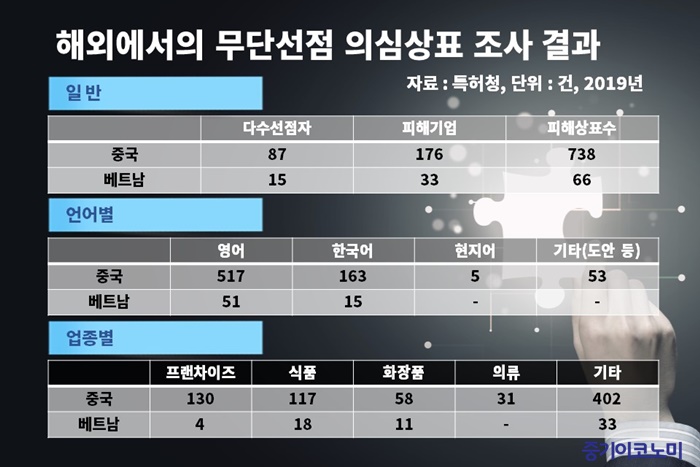ƯÇãûÀÌ ÇØ¿Ü ¹«´Ü¼±Á¡ ÀǽɻóÇ¥¸¦ ¸ð´ÏÅ͸µ ÇÑ °á°ú¿¡ µû¸£¸é, Áö³ÇØ Áß±¹¿¡¼´Â ÇÑÇØ µ¿¾È ¿ì¸®±â¾÷ 176°³»ç, ÃÑ 738°ÇÀÇ »óÇ¥°¡ ¹«´Ü¼±Á¡µÈ °ÍÀ¸·Î ³ªÅ¸³µ´Ù. º£Æ®³²¿¡¼´Â ¿ì¸®±â¾÷ 33°³»ç, ÃÑ 66°ÇÀÇ »óÇ¥°¡ ¹«´Ü¼±Á¡µÈ °ÍÀ¸·Î ÆÄ¾ÇµÆ´Ù.