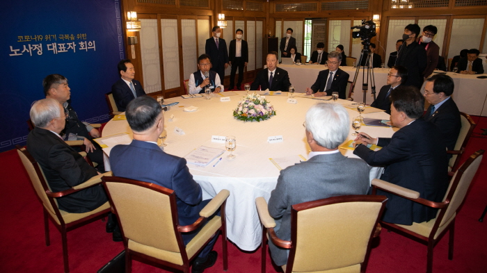 ¡®Äڷγª19 À§±â ±Øº¹À» À§ÇÑ ³ë»çÁ¤´ëÇ¥ÀÚȸÀÇ¡¯´Â ±¹¹«ÃѸ®½Ç ÁÖ°üÀ¸·Î ¿î¿µµÈ´Ù. Çѱ¹³ëÃÑ¡¤¹ÎÁÖ³ëÃÑ¡¤°æÃÑ¡¤´ëÇÑ»óÀÇ¿¡ ±âȹÀçÁ¤ºÎ¿Í °í¿ë³ëµ¿ºÎ Àå°üÀÌ Âü¿©Çϰí, °æÁ¦»çȸ³ëµ¿À§¿øÈ¸ À§¿øÀå°ú ÀÏÀÚ¸®À§¿øÈ¸ ºÎÀ§¿øÀåÀÌ ¹è¼®Çϱâ·Î Çß´Ù.