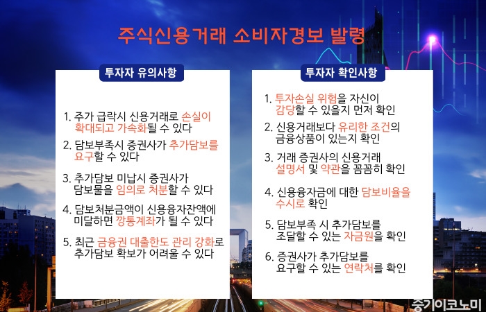 ±ÝÀ¶°¨µ¶¿øÀº ½Å¿ë°Å·¡¸¦ ÅëÇÑ ·¹¹ö¸®Áö ÅõÀÚÀÇ °æ¿ì ÁÖ°¡ »ó½Â½Ã Ãß°¡ ¼öÀÍÀ» ¾òÀ» ¼ö ÀÖÁö¸¸, ÁÖ°¡ Ç϶ô½Ã ½Å¿ë°Å·¡ ´ãº¸À¯ÁöºñÀ² ¹Ì´Þ·Î ÀÎÇØ ¹Ý´ë¸Åµµ ¹°·®ÀÌ Áõ°¡ÇÏ°í ¶Ç´Ù½Ã ÁÖ°¡ ±Þ¶ôÀ¸·Î ¿¬¼âÀÛ¿ëÀÌ À̾îÁ® ÅõÀÚ¼Õ½ÇÀÌ °¡¼ÓÈ µÉ ¼ö ÀÖ´Ù°í ¼³¸íÇß´Ù.ÅõÀÚÇÑ ÁÖ½ÄÀÇ °¡°ÝÀÌ Ç϶ôÇØ ½Å¿ë°Å·¡ ´ãº¸ À¯ÁöºñÀ²(Åë»ó 140%ÀÌ»ó)ÀÌ ¹Ì´ÞµÇ¸é ÅõÀÚÀÚ´Â ´ÙÀ½ ¿µ¾÷ÀϱîÁö Çö±ÝÀ¸·Î Ãß°¡´ãº¸¸¦ ³³ÀÔÇØ¾ß ÇÑ´Ù. ±âÇÑ ³» Ãß°¡´ãº¸¸¦ ³³ÀÔÇÏÁö ¾ÊÀº °æ¿ì, Áõ±Ç»ç´Â ÁÖ½ÄÀ» ÀüÀÏÁ¾°¡¿¡¼ ÀÏÁ¤ºñÀ²(Åë»ó 15~20%) ÇÒÀÎÇÑ °¡°ÝÀ¸·Î ¸ÅµµÁÖ¹®Çϸç, À̶§ ¹Ý´ë¸ÅµµÇÏ´Â ±Ý¾×Àº ´ãº¸ºÎÁ·¾×º¸´Ù ÈξÀ ¸¹À» ¼ö ÀÖ´Ù.º¸À¯ÁÖ½ÄÀÌ ´Ü±â°£¿¡ ±Þ¶ôÇÏ´Â °æ¿ì º¸À¯ÁÖ½Ä ÀüºÎ°¡ ¹Ý´ë¸Åµµ µÉ ¼ö ÀÖ´Ù. º¸À¯ÁÖ½ÄÀÌ ¸ðµÎ ¹Ý´ë¸Åµµ µÇ´õ¶óµµ ½Å¿ëÀ¶ÀÚÀܾ×ÀÌ ³²¾ÆÀÖÀ¸¸é ¿©ÀüÈ÷ »óȯÀǹ«¸¦ ºÎ´ãÇÏ´Â ±øÅë°èÁ°¡ µÅ ¿ø±ÝÀ» ÃʰúÇÏ´Â ¼Õ½ÇÀÌ ¹ß»ýÇÒ ¼ö ÀÖ´Ù.±Ý°¨¿øÀº ÁÖ½Ä ½Å¿ë°Å·¡¿¡ ¾Õ¼ ÅõÀÚ¼Õ½Ç À§ÇèÀ» ÀÚ½ÅÀÌ °¨´çÇÒ ¼ö ÀÖ´Â Áö ¸ÕÀú È®ÀÎÇϰí, ½Å¿ë°Å·¡º¸´Ù À¯¸®ÇÑ Á¶°ÇÀÇ ±ÝÀ¶»óǰÀÌ ÀÖ´ÂÁö È®ÀÎÇØ¾ß ÇÑ´Ù°í ´çºÎÇß´Ù. ¶Ç °Å·¡ Áõ±Ç»çÀÇ ½Å¿ë°Å·¡ ¼³¸í¼ ¹× ¾à°üÀ» ²Ä²ÄÈ÷ È®ÀÎÇÏ¸ç ½Å¿ëÀ¶Àڱݿ¡ ´ëÇÑ ´ãº¸ºñÀ²À» ¼ö½Ã·Î È®ÀÎÇØ¾ßÇÑ´Ù°í µ¡ºÙ¿´´Ù. Áß±âÀÌÄÚ³ë¹Ì ±èÁØÈ£ ±âÀÚ<ÀúÀÛ±ÇÀÚ ¨Ï Áß±âÀÌÄÚ³ë¹Ì. ¹«´ÜÀüÀç ¹× Àç¹èÆ÷ ±ÝÁö>