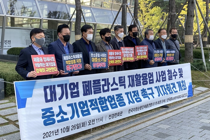 Çѱ¹ÀÚ¿ø¼øÈ¯´ÜüÃÑ¿¬¸Í ¼Ò¼Ó 61°³ ´Üü¿Í Àü±¹°í¹°»ó¿¬ÇÕȸ, Çѱ¹ÇÃ¶ó½ºÆ½´ÜÀÏÀçÁúÇùȸ, Çѱ¹Áß¼Ò»óÀÎÀÚ¿µ¾÷ÀÚÃÑ¿¬ÇÕȸ µîÀº 26ÀÏ ¿©Àǵµ Àü±¹°æÁ¦Àο¬ÇÕȸ ȸ°ü ¾Õ¿¡¼ ´ë±â¾÷ÀÇ ÆóÇÃ¶ó½ºÆ½ ÀçȰ¿ë¾÷ ö¼ö¸¦ Ã˱¸Çϰí, Áß¼Ò±â¾÷ÀûÇÕ¾÷Á¾À¸·Î ½ÅûÇß´Ù°í ¹àÇû´Ù.
