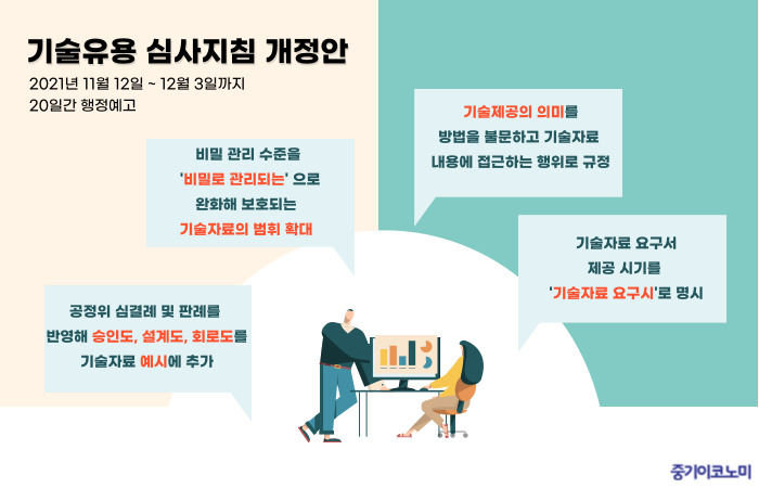 °øÁ¤°Å·¡À§¿øÈ¸´Â Áß¼Ò±â¾÷ ±â¼úÀÚ·á ¹üÀ§¸¦ È®´ëÇÑ ±â¼úÀÚ·á Á¦°ø ¿ä±¸¡¤À¯¿ëÇàÀ§ ½É»çÁöħ °³Á¤¾ÈÀ» 12¿ù3ÀϱîÁö 20Àϰ£ ÇàÁ¤¿¹°íÇÑ´Ù°í 12ÀÏ ¹àÇû´Ù.À̹ø Áöħ°³Á¤Àº ºñ¹ÐÀ¯Áö°è¾à ü°á Àǹ« ½Å¼³ µîÀ» ³»¿ëÀ¸·Î ÇÏ´Â Çϵµ±Þ¹ý°³Á¤¾ÈÀÌ ³»³â 2¿ù18ÀÏ ½ÃÇàµÊ¿¡ µû¶ó ÀÌ·ïÁ³´Ù.°³Á¤¾È¿¡ µû¸£¸é, Çϵµ±Þ¹ý °³Á¤À¸·Î ±â¼úÀÚ·á·Î º¸È£µÇ±â À§ÇØ ÇÊ¿äÇÑ ºñ¹Ð °ü¸® ¼öÁØÀ» ¡®ÇÕ¸®Àû ³ë·Â¿¡ ÀÇÇØ ºñ¹Ð·Î À¯ÁöµÈ¡¯¿¡¼ ¡®ºñ¹Ð·Î °ü¸®µÇ´Â¡¯À¸·Î º¸È£µÇ´Â ±â¼úÀÚ·áÀÇ ¹üÀ§¸¦ È®´ëÇß´Ù.¼Ò±â¾÷ÀÇ °æ¿ì ±â¼úÀڷḦ ºñ¹Ð·Î °ü¸®ÇÒ Àη¡¤ÀÚ¿øÀÌ ºÎÁ·ÇÑ Á¡À» °í·ÁÇØ ´õ ¿ÏÈµÈ ±âÁØÀ» Àû¿ëÇϵµ·Ï Çß´Ù.°øÁ¤À§ ½É°á·Ê ¹× ÆÇ·Ê¸¦ ¹Ý¿µÇØ ±â¼úÀÚ·á ¿¹½Ã·Î ½ÂÀεµ, ¼³°èµµ, ȸ·Îµµ¸¦ Ãß°¡Çß´Ù. ¶Ç ±â¼úÀÚ·á ¿ä±¸¼´Â ±â¼úÀÚ·á ¿ä±¸¼¸¦ ±â¼úÀÚ·á ¿ä±¸½Ã Á¦°øÅä·Ï ¸í½ÃÇØ ÀÚ·á ¿ä±¸ ÈÄ ¼ö³â µÚ »çÈÄ ¹ß±ÞÇÏ´Â »ç·Ê¸¦ Â÷´ÜÇß´Ù.Áß¼Ò±â¾÷ ±â¼úÀÚ·á º¸È£¸¦ °ÈÇϱâ À§ÇØ ±â¼úÀÚ·á Á¦°øÀÇ Àǹ̸¦ ´Ü¼øÈ÷ ±â¼úÀڷḦ ¹°¸®ÀûÀ¸·Î Á¦°øÇÏ´Â ÇüŸ¦ ³Ñ¾î, ¹æ¹ýÀ» ºÒ¹®ÇÏ°í ±â¼úÀÚ·á ³»¿ë¿¡ Á¢±ÙÇÏ°Ô ÇÏ´Â ÇàÀ§·Î ±ÔÁ¤Çß´Ù. Áß±âÀÌÄÚ³ë¹Ì ±èÁØÈ£ ±âÀÚ