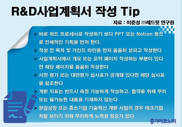 ÀÌ ¿¬±¸¿øÀº R&D »ç¾÷°èȹ¼­´Â ¿ä±¸ Ç׸ñ¿¡ µû¶ó ¼ö¸¹Àº ÆäÀÌÁö¸¦ ÀÛ¼ºÇØ¾ß ÇϹǷΠ°¢ Ç׸ñÀÇ À¯±âÀûÀÎ ¿¬°áÀÌ Áß¿äÇÏ´Ù°í °­Á¶Çß´Ù. ¶Ç, ½Åû±âÇÑ¿¡ ÀÓ¹ÚÇØ ±ÞÇÏ°Ô ÀÛ¼ºÇϱ⠺¸´Ù 3ÁÖ Á¤µµÀÇ ±â°£À» ¼³Á¤ÇØ ÀÛ¼ºÇÒ °ÍÀ» ÃßõÇß´Ù.