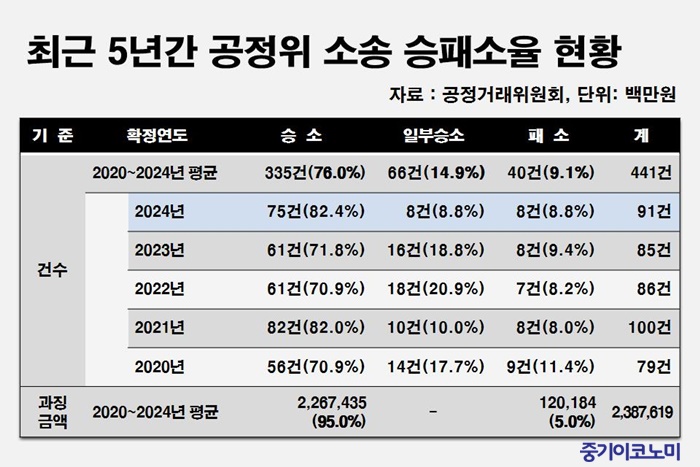 ÇÑÆí, 2024³â °á°ú¸¦ Æ÷ÇÔÇØ °øÁ¤À§´Â ÃÖ±Ù 5³â°£(2020~2024³â) ÆÇ°áÀÌ È®Á¤µÈ ÃÑ 441°ÇÀÇ ¼Ò¼Û °¡¿îµ¥ 401°Ç(ÀÏºÎ½Â¼Ò Æ÷ÇÔ)À» ½Â¼ÒÇßÀ¸¸ç, ¼Ò¼Û°Ç¼ö ±âÁØ 90.9%ÀÇ ½Â¼ÒÀ²À» ±â·ÏÇß´Ù. °ú¡±Ý¾× ±âÁØÀ¸·Îµµ ÃÖ±Ù 5³â°£ ÆÇ°áÀÌ È®Á¤µÈ 2Á¶3876¾ï¿ø °ú¡±Ý °¡¿îµ¥ 95.0%(2Á¶2674¾ï¿ø)¿¡ ´ëÇØ óºÐÀÇ Àû¹ý¼ºÀÌ È®Á¤µÆ´Ù.