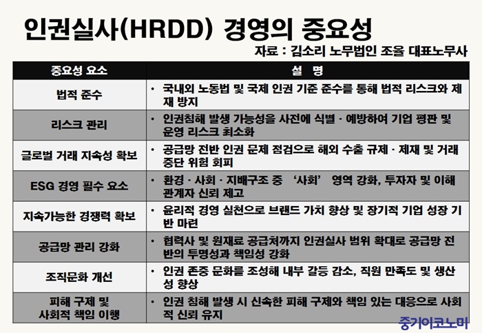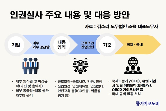 ÀÎ±Ç½Ç»ç ´ëÀÀÀ» À§Çؼ´Â ¡ã±Ù·Î½Ã°£ ¡ãÀÓ±Ý ¡ã»ê¾÷¾ÈÀüº¸°Ç µîÀÌ ÇÙ½É °ü¸®Ç׸ñÀ̸ç, ÇØ´ç ±¹°¡ÀÇ ³ëµ¿¹ý°ú ±¹Á¦±âÁØÀ» µ¿½Ã¿¡ °í·ÁÇØ¾ß ÇÑ´Ù. ±è ³ë¹«»ç´Â ƯÈ÷ Çù·Â»ç °ü¸®¸¦ 1Â÷ º¥´õ¿¡ ±¹ÇÑÇÏÁö ¸»°í, ¿øÀç·á °ø±Þó±îÁö È®´ëÇØ¾ß ÇÑ´Ù°í °Á¶Çß´Ù.