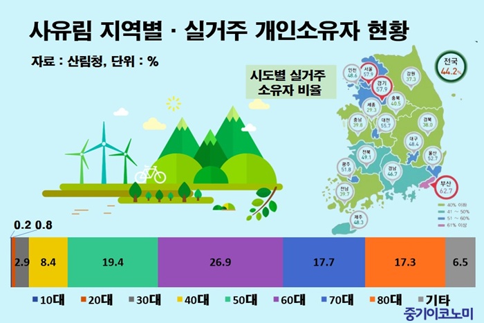 Àüü »çÀ¯¸² ¼ÒÀ¯ÀÚ °¡¿îµ¥ 0.5Çퟸ£ ¹Ì¸¸À» ¼ÒÀ¯ÇÑ »êÁÖ´Â ÀüüÀÇ 56.0%·Î, ÃÖ±Ù 5³â°£ ²ÙÁØÈ÷ Áõ°¡ÇÏ´Â Ãß¼¼´Ù. ¿¬µµº°·Î´Â 2020³â 120¸¸8000¸í¿¡¼ 2021³â 121¸¸9000¸í, 2022³â 122¸¸7000¸í, 2023³â 123¸¸1000¸íÀ» °ÅÃÄ ¿ÃÇØ±îÁö Áõ°¡¼¼¸¦ À̾´Ù.°³ÀÎ ¼ÒÀ¯ÀÚ Áß »ê¸² ¼ÒÀçÁö¿¡ ½ÇÁ¦ °ÅÁÖÇÏ´Â ÀοøÀº 96¸¸¸í(44.2%)À¸·Î 1³âÀüº¸´Ù ¼ÒÆø »ó½ÂÇß´Ù. ¼ÒÀçÁö °ÅÁÖ ºñÀ²Àº µµ Áö¿ªÀ» Áß½ÉÀ¸·Î Áö¼ÓÀûÀÎ Áõ°¡¼¼¸¦ º¸À̰í ÀÖ´Ù.