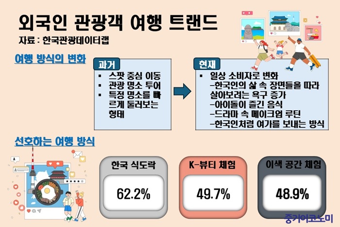 Çѱ¹À» ã´Â ¿Ü±¹ÀÎ °ü±¤°´ÀÌ °ú°Å ¸í¼Ò À§ÁÖÀÇ ´Ü±â °ü±¤¿¡¼ ¹þ¾î³ª Çѱ¹ÀÎÀÇ ÀÏ»ó ¼Ó ¹®È¸¦ Áñ±â´Â ¹æÇâÀ¸·Î À̵¿Çϰí ÀÖ´Ù. Çѱ¹°ü±¤°ø»ç°¡ 2024~2025³â »ó¹Ý±â Ä«µå µ¥ÀÌÅÍ¿Í ¼Ò¼È¹Ìµð¾î ¾ð±Þ·®À» ºÐ¼®ÇÑ °á°ú, ¹æÇÑ ¿Ü±¹ÀÎÀÇ ¼Òºñ ÆÐÅÏÀº ³»±¹ÀÎÀÇ ¿©Çà Æ®·»µå¿Í 90% ÀÌ»ó À¯»çÇÑ °ÍÀ¸·Î ³ªÅ¸³µ´Ù.