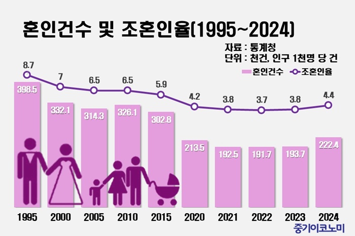 Àα¸ 1000¸í´ç È¥ÀÎ °Ç¼ö¸¦ ¶æÇÏ´Â Á¶È¥ÀÎÀ²Àº 1995³â 8.7°Ç¿¡¼ 2024³â 4.4°ÇÀ¸·Î Àý¹Ý °¡±îÀÌ ÁÙ¾ú´Ù.