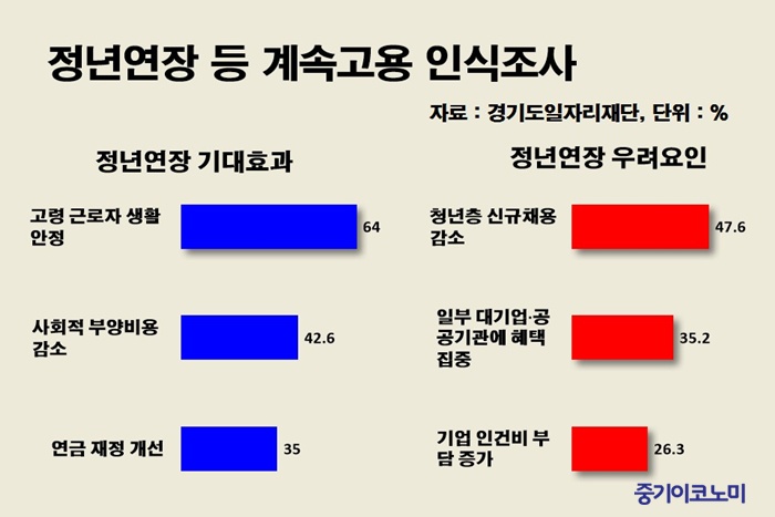 Á¤³â ¿¬ÀåÀÇ ±â´ëÈ¿°ú·Î´Â ¡®°í·É ±Ù·ÎÀÚ »ýȰ ¾ÈÁ¤(64.0%)¡¯ÀÌ °¡Àå ³ô°Ô ²ÅÇû´Ù. ÀÌ¾î ¡®»çȸÀû ºÎ¾çºñ¿ë °¨¼Ò(42.6%)¡¯, ¡®¿¬±Ý ÀçÁ¤ °³¼±(35.0%)¡¯ ¼øÀ̾ú´Ù. ¹Ý¸é, ¡®Ã»³âÃþ ½Å±Ôä¿ë °¨¼Ò(47.6%)¡¯, ¡®´ë±â¾÷¡¤°ø°ø±â°ü¿¡ ÇýÅà ÁýÁß(35.2%)¡¯, ¡®±â¾÷ ÀΰǺñ ºÎ´ã Áõ°¡(26.3%)¡¯ µîÀº ÁÖ¿ä ¿ì·Á ¿äÀÎÀ¸·Î ³ªÅ¸³µ´Ù.