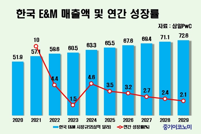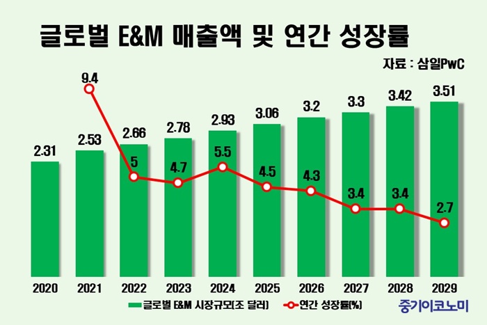 »ïÀÏPwC°¡ Àü¸ÁÇÑ ±Û·Î¹ú E&M ½ÃÀåÀº 2024³â 2Á¶9000¾ï ´Þ·¯¿¡¼ 2029³â 3Á¶5000¾ï ´Þ·¯·Î ¿¬Æò±Õ 3.7% ¼ºÀåÇÒ °ÍÀ¸·Î º¸ÀδÙ.