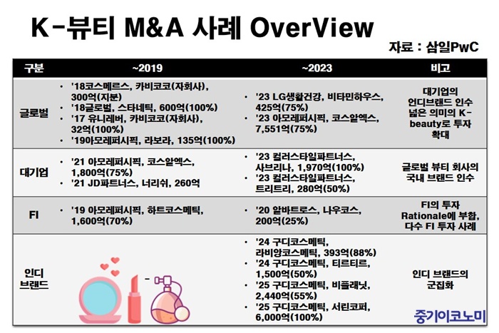 º¸°í¼´Â ÃÖ±Ù 10¿© ³â°£ K-ºäƼ M&A È帧ÀÌ Å©°Ô º¯ÈÇß´Ù°í ºÐ¼®Çß´Ù. 2017~2019³â¿¡´Â ±Û·Î¹ú ºäƼ ±â¾÷µéÀÌ ±¹³» ¼±µµ ºê·£µå¸¦ ÀμöÇÏ¸ç ½ÃÀå¿¡ ÁøÀÔÇßÁö¸¸, ¾Æ¸ð·¹ÆÛ½ÃÇÈÀÇ ÄÚ½º¾Ë¿¢½º(COSRX) Àμö¸¦ ±âÁ¡À¸·Î ±¹³» ´ë±â¾÷ÀÌ À¯¸Á Àεðºê·£µå¸¦ Èí¼öÇÏ´Â Àü·«À¸·Î ¹æÇâÀÌ ÀüȯµÆ´Ù. ÇöÀç´Â À繫Àû ÅõÀÚÀÚ(FI)±îÁö °¡¼¼ÇÏ¸é¼ »ê¾÷ Àü¹Ý¿¡¼ Ȱ¹ßÇÑ °Å·¡°¡ À̾îÁö°í ÀÖ´Ù.