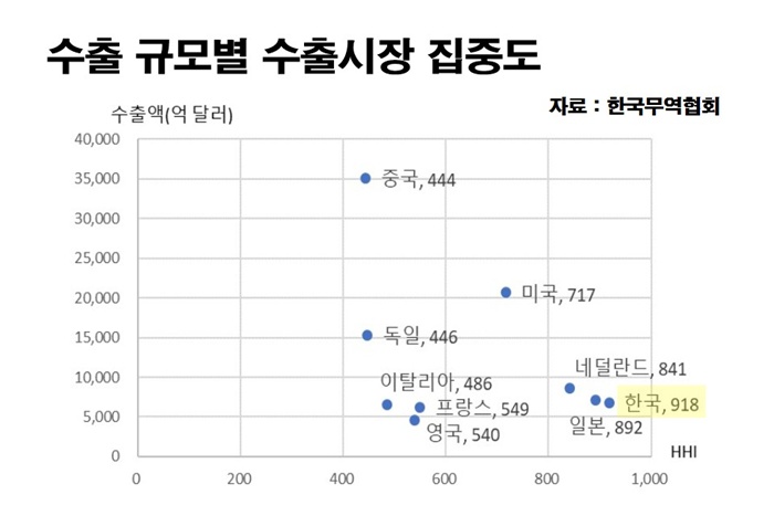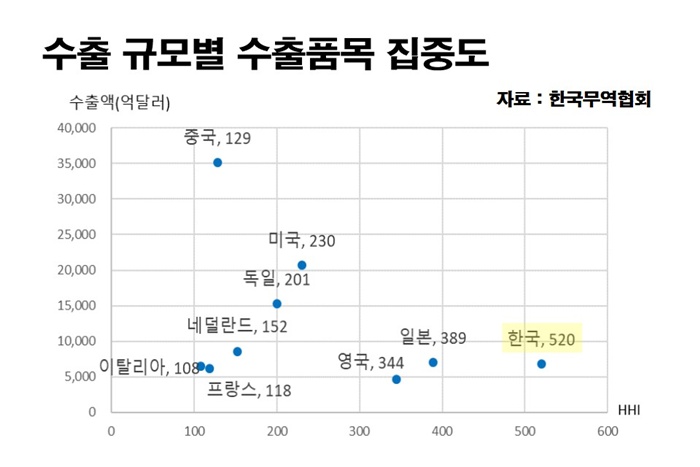 º¸°í¼­¿¡ µû¸£¸é 2024³â Çѱ¹ÀÇ ¼öÃâ±¹ ¹× ǰ¸ñ ÁýÁßµµ Áö¼ö(HHI)´Â °¢°¢ 918, 520À¸·Î, ¼¼°è 10´ë ¼öÃâ±¹(È«Äá Á¦¿Ü) °¡¿îµ¥ °¡Àå ³ôÀº ¼öÁØÀ» ±â·ÏÇß´Ù. ÀÌ´Â ÀϺ»(892, 389), ÇÁ¶û½º(549, 118), ÀÌÅ»¸®¾Æ(486, 108) µî ÁÖ¿ä±¹º¸´Ùµµ ÁýÁßµµ°¡ ³ô´Ù´Â Àǹ̴Ù. HHI Áö¼ö´Â ³·À»¼ö·Ï ¼öÃâ Æ÷Æ®Æú¸®¿À°¡ ´Ù¾çÇÏ°Ô ºÐ»êµÅ ÀÖÀ½À» ¶æÇÑ´Ù.
