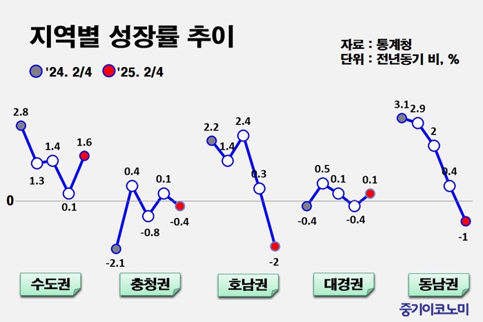 Åë°èûÀÌ 26ÀÏ ¹ßÇ¥ÇÑ ¡®2025³â 2ºÐ±â ½ÇÁú Áö¿ª³»ÃÑ»ý»ê(GRDP, ÀáÁ¤Ä¡)¡¯¿¡ µû¸£¸é Àü±¹ GRDP´Â Àü³â µ¿±â ´ëºñ 0.4% Áõ°¡Çß´Ù. ±Ç¿ªº°·Î´Â ¼öµµ±Ç(1.6%)°ú ´ë°æ±Ç(0.1%)ÀÌ ¼ºÀåÇßÀ¸³ª, È£³²±Ç(-2.0%), µ¿³²±Ç(-1.0%), ÃæÃ»±Ç(-0.4%)Àº °¨¼Ò¼¼¸¦ ±â·ÏÇß´Ù.