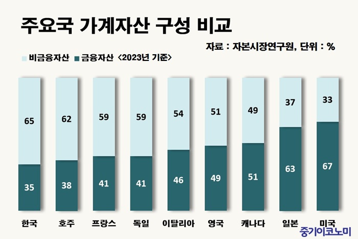 Á¤ ¿¬±¸À§¿ø¿¡ µû¸£¸é, ¿ì¸®³ª¶ó °¡°èÀÇ GDP ´ëºñ ¼øÀÚ»ê ¹èÀ²Àº 5.25·Î ÁÖ¿ä±¹ Æò±Õ°ú ºñ½ÁÇÑ ¼öÁØÀÌ´Ù. ±×·¯³ª ÀÚ»ê ±¸¼ºÀº Å©°Ô ´Ù¸£´Ù. 2023³â ±âÁØ ¿ì¸®³ª¶ó °¡°èÀÚ»êÀÇ ºñ±ÝÀ¶ÀÚ»ê(ÁÖ·Î ºÎµ¿»ê) ºñÁßÀº 65%, ±ÝÀ¶ÀÚ»êÀº 35%¿¡ ±×Ä£´Ù. ¹Ý¸é ¹Ì±¹Àº Áֽġ¤Ã¤±Ç¡¤ÆÝµå¡¤¿¬±Ý µî ÀÚº»½ÃÀå ÀÚ»êÀÇ ÇÕ°è ºñÁßÀÌ ¾à 50%¿¡ ´ÞÇÑ´Ù.