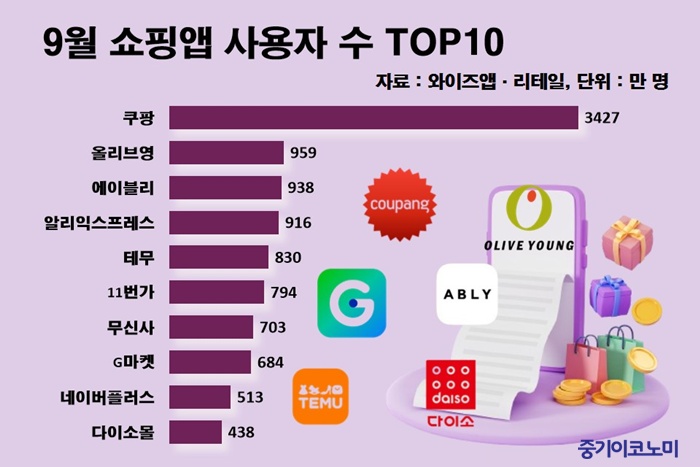 ¾Û¡¤°áÁ¦ µ¥ÀÌÅÍ ±â¹Ý ½ÃÀåºÐ¼® ¼Ö·ç¼Ç ¿ÍÀÌÁî¾Û¡¤¸®Å×ÀÏÀÌ 22ÀÏ ¹ßÇ¥ÇÑ ¼îÇÎ ¾ÛÀÇ ¿ù°£ Ȱ¼º »ç¿ëÀÚ ¼ö(MAU) Á¶»ç °á°ú¸¦ º¸¸é, Áö³ 9¿ù °¡Àå ¸¹ÀÌ »ç¿ëÇÑ ¼îÇÎ¾Û TOP3´Â ÄíÆÎ(3427¸¸ ¸í), ¿Ã¸®ºê¿µ(959¸¸ ¸í), ¿¡ÀÌºí¸®(938¸¸ ¸í) ¼øÀ̾ú´Ù.