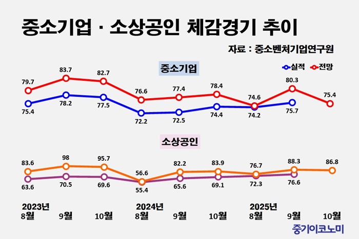Áß¼Òº¥Ã³±â¾÷¿¬±¸¿ø(KOSI)ÀÌ ÃÖ±Ù ¹ßÇ¥ÇÑ ¡®KOSI Áß¼Ò±â¾÷µ¿Çâ 2025³â 10¿ùÈ£¡¯¿¡ µû¸£¸é, 9¿ù Áß¼Ò±â¾÷ ½ÇÀû SBHI´Â Àü³â µ¿¿ù ´ëºñ 3.2Æ÷ÀÎÆ® »ó½ÂÇÑ 75.7À» ±â·ÏÇß´Ù. ¼Ò»ó°øÀΠü°¨ BSI ¿ª½Ã 11.0Æ÷ÀÎÆ® »ó½ÂÇÑ 76.6À¸·Î °³¼±µÆ´Ù. ÀÌ´Â Áö³­ÇØ ³»¼ö ºÎÁø¿¡ µû¸¥ ±âÀúÈ¿°ú¿Í ¹Î»ýȸº¹ ¼ÒºñÄíÆù Áö±Þ ¿µÇâÀÌ º¹ÇÕÀûÀ¸·Î ÀÛ¿ëÇÑ °á°ú·Î ºÐ¼®µÈ´Ù.