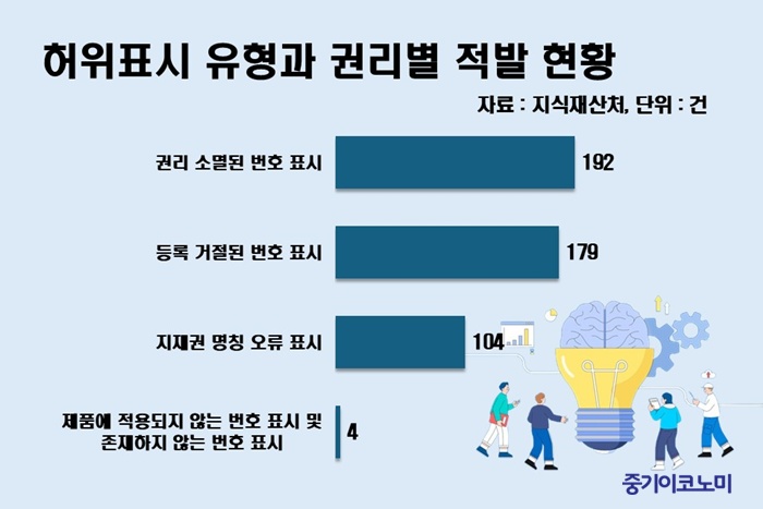 ÇãÀ§Ç¥½Ã À¯Çüº°·Î´Â ¡ãµî·ÏÀÌ °ÅÀýµÈ ±Ç¸®¸¦ µî·Ï¹ÞÀº °Íó·³ Ç¥½ÃÇÑ »ç·Ê°¡ 179°Ç, ¡ãÀÌ¹Ì ¼Ò¸êµÈ ±Ç¸®¸¦ À¯È¿ÇÑ °Íó·³ Ç¥±âÇÑ »ç·Ê°¡ 192°ÇÀ¸·Î, ±Ç¸®°¡ ÀüÇô Á¸ÀçÇÏÁö ¾ÊÀ½¿¡µµ ƯÇã¹øÈ£ µîÀ» ³»¼¼¿î ¡®¹«±Ç¸® ÇãÀ§Ç¥½Ã¡¯°¡ ÀüüÀÇ 77.5%¿¡ ´ÞÇß´Ù.
