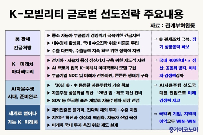 Á¤ºÎ´Â À̹ø ¡®K-¸ðºô¸®Æ¼ ±Û·Î¹ú ¼±µµÀü·«¡¯À» ÅëÇØ º¸È£¹«¿ª, ±â¼ú°æÀï, °ø±Þ¸Á º¯È µî ´ëÀüȯ±â ¼Ó¿¡¼ ÀÚµ¿Â÷ »ê¾÷ÀÇ Áö¼Ó°¡´ÉÇÑ ¼ºÀåÀ» µÞ¹ÞħÇϰڴٴ ÀÇÁö¸¦ ºÐ¸íÈ÷ Çß´Ù. ÀÚµ¿Â÷ »ê¾÷ÀÌ Çѱ¹ Á¦Á¶¾÷ÀÇ ÇÙ½É µ¿·ÂÀÎ ¸¸Å Á¤Ã¥ ÀÌÇà ¼Óµµ¸¦ ³ô¿© ¹Ì·¡ °æÀï·ÂÀ» È®º¸Çϰڴٴ ¹æÄ§ÀÌ´Ù. Áß±âÀÌÄÚ³ë¹Ì ä¹Î¼± ±âÀÚ