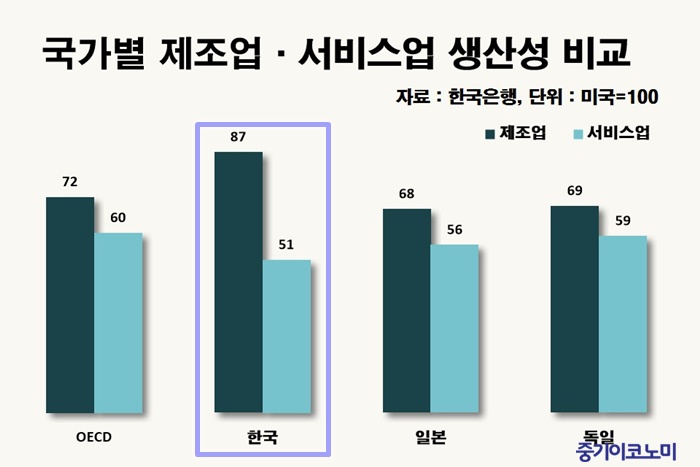 ±×·¯³ª »ý»ê¼ºÀº Á¤Ã¼µÅ ÀÖ´Ù. ¹Î°£ ¼ºñ½º¾÷ÀÇ 1ÀÎ´ç ³ëµ¿»ý»ê¼ºÀº Áö³ 20³â µ¿¾È Á¦Á¶¾÷ÀÇ 40% ¼öÁØ¿¡ ¸Ó¹°·¶À¸¸ç, Á¦Á¶¾÷ ºñÁßÀÌ Å« ÀϺ»¡¤µ¶ÀϺ¸´Ù °ÝÂ÷°¡ ´õ Å©´Ù. Á¤ Â÷ÀåÀº ¡°¼ºñ½º¾÷ÀÇ ³·Àº »ý»ê¼ºÀº ¿ì¸® °æÁ¦ÀÇ ¼ºÀå ÀáÀç·ÂÀ» Á¦¾àÇØ ¿Â ±¸Á¶Àû ¿äÀΡ±À̶ó°í Çß´Ù.