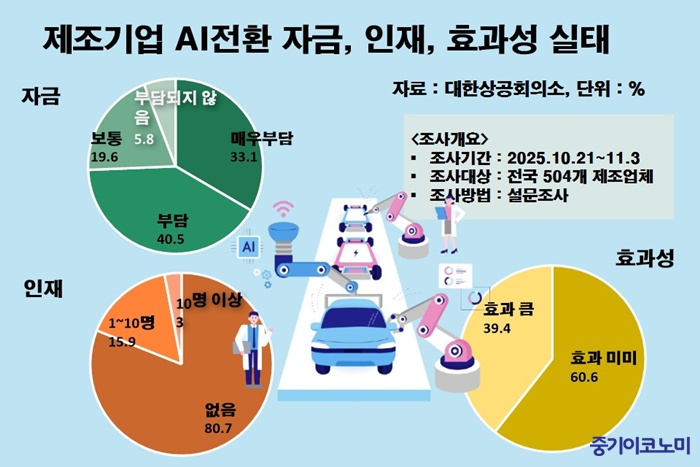 Á¦Á¶ ´ë±â¾÷µéÀÇ AI ¼Ö·ç¼Ç µµÀÔÀÌ Àý¹Ý ¼öÁØ¿¡ ¸Ó¹® °ÍÀ¸·Î ³ªÅ¸³µ´Ù. Áß¼Ò±â¾÷ÀÇ °æ¿ì´Â 5%¸¦ ¹Øµ¹¾Ò´Ù.´ëÇÑ»ó°øÈ¸ÀǼҰ¡ 18ÀÏ Æì³½ ¡®K-¼ºÀå ½Ã¸®Áî(7) ±â¾÷ÀÇ AI Àüȯ ½ÇÅÂ¿Í °³¼±¹æ¾È¡¯ º¸°í¼¿¡ µû¸£¸é, ±¹³» 504°³ Á¦Á¶±â¾÷À» ´ë»óÀ¸·Î Á¶»çÇÑ °á°ú 82.3%°¡ AI¸¦ °æ¿µ¿¡ Ȱ¿ëÇÏÁö ¾Ê°í ÀÖ´Ù°í ´äÇß´Ù. Á¶»ç´Â °³ÀÎ ´ÜÀ§ÀÇ »ý¼ºÇü AI »ç¿ëÀº Á¦¿ÜÇϰí, »ý»ê¡¤¹°·ù¡¤¿î¿µ µî AI ¼Ö·ç¼Ç µµÀÔ¡¤È°¿ë ¿©ºÎ¸¦ ¹°¾ú´Ù.´ë±â¾÷µéÀÌ Áß¼Ò±â¾÷º¸´Ù AI¸¦ ´õ ¸¹ÀÌ È°¿ëÇÏ´Â °ÍÀ¸·Î ³ªÅ¸³µÁö¸¸, ±×¸¶Àúµµ 49.2%·Î Àý¹ÝÀ» ¹Øµ¹¾Ò´Ù. Áß¼Ò±â¾÷ÀÇ °æ¿ì´Â AI¸¦ Ȱ¿ëÇÑ´Ù´Â ÀÀ´äÀÌ 4.2%¿¡ ºÒ°úÇß´Ù.Á¦Á¶±â¾÷µéÀÇ AI ¼Ö·ç¼Ç µµÀÔÀÌ ¹ÌÁøÇÑ ÀÌÀ¯·Î´Â ºñ¿ë°ú Àη µîÀÌ ¿øÀÎÀ¸·Î ²ÅÇûÁö¸¸, À̹ø Á¶»ç¿¡¼ µÎµå·¯Áø Á¡Àº ¡®AIÀÇ È¿°ú¼º¡¯¿¡ ´ëÇÑ È®½Å ºÎÁ·À̾ú´Ù. ¡®AI ÀüȯÀÌ ¼º°ú¸¦ °¡Á®´Ù ÁÙ °ÍÀ¸·Î ±â´ëÇÏ´ÂÁö¡¯¸¦ ¹¯´Â Áú¹®¿¡ ÀÀ´ä±â¾÷ÀÇ 60.6%´Â ¡®È¿°ú°¡ ¹Ì¹ÌÇÒ °Í¡¯À¸·Î ¹Ù¶óºÃ´Ù. È¿°ú°¡ Ŭ °ÍÀ̶õ ÀÀ´äÀº 39.4%¿´´Ù.º¸°í¼´Â OECD°¡ G7 ¹× ºê¶óÁú ±â¾÷µéÀ» ´ë»óÀ¸·Î ½Ç½ÃÇÑ ¼³¹®Á¶»ç¿¡¼µµ AIÀÇ µµÀÔ¡¤È°¿ëÀ» ÀúÇØÇÏ´Â ¿äÀÎ Áß Çϳª·Î ¡®ÅõÀÚ ¼öÀÍ·ü ÃßÁ¤ÀÇ ¾î·Á¿ò¡¯ÀÌ Áö¸ñµÈ ¹Ù ÀÖ´Ù°í ¤¾ú´Ù. ¶Ç 2024³â ÇÑ ÄÁ¼³ÆÃ ȸ»çÀÇ Á¶»ç¿¡¼µµ ±¹³»±â¾÷ CEOÀÇ 57%°¡ ¡®AI ÅõÀÚ ´ëºñ È¿°ú¿¡ ´ëÇÑ ºÒÈ®½Ç¼º¡¯À» AI µµÀÔÀÇ °É¸²µ¹·Î ²ÅÀº »ç½ÇÀÌ ÀÖ´Ù°í ¼³¸íÇß´Ù.Àηµµ ¾ø°í, Ãæ¿øµµ ¾ÈÇØ¡¦Á¦Á¶ AI Àüȯ ³¸ÁAI ÅõÀÚºñ¿ë¿¡ ´ëÇØ¼´Â ±â¾÷ÀÇ 73.6%´Â ¡®ºÎ´ãÀÌ µÈ´Ù¡¯°í ´äÇß´Ù. ´ë±â¾÷(57.1%)º¸´Ù Áß¼Ò±â¾÷(79.7%)¿¡¼ ºÎ´ãµÈ´Ù´Â ÀÀ´äÀÌ ´õ ¸¹¾Ò´Ù.AIÀÇ ¿¬·á¶ó ÇÒ ¼ö ÀÖ´Â µ¥ÀÌÅÍ È°¿ë¿¡¼µµ ÀÀ´ä±â¾÷ÀÇ Àý¹Ý(49.2%)Àº ¡®Àü¹®Àη ä¿ë ºÎ´ã¡¯À» ¾î·Á¿î Á¡À¸·Î ²Å¾Ò´Ù. À̹ۿ¡ ¡®°³ÀÎÁ¤º¸ À̽´¿¡ µû¸¥ ±ÔÁ¦ ºÎ´ã¡¯(20.2%), ¡®µ¥ÀÌÅÍ Á¤Á¦ ºÎ´ã¡¯(16.3%), ¡®µ¥ÀÌÅÍ ¼öÁý ½Ã¼³ ºÎ´ã¡¯(14.3%) µîÀÌ µÚ¸¦ À̾ú´Ù.AI Ȱ¿ëÀ» À§ÇÑ Àü¹®Àη¿¡ ´ëÇØ¼´Â ±â¾÷ÀÇ 80.7%°¡ ¡®¾ø´Ù¡¯°í ´äÇß´Ù. AI ÀηÂÃæ¿ø¿¡ ´ëÇØ¼´Â 82.1%°¡ Ãæ¿øÇϰí ÀÖÁö ¾Ê´Â °ÍÀ¸·Î ³ªÅ¸³µ´Ù. ³»ºÎÁ÷¿ø ±³À°À» ÅëÇØ Àü¹®ÀηÂÀ¸·Î ÀüȯÇÑ´Ù´Â ±â¾÷(14.5%)À̳ª ½Å±Ô ä¿ëÇÑ´Ù´Â ±â¾÷(3.4%)Àº 17.9%¿¡ ºÒ°úÇß´Ù.º¸°í¼´Â ¡°Çѱ¹ÀÇ AI ÀÎÀç´Â 2¸¸1000¸í ¼öÁØÀ¸·Î Áß±¹(41¸¸1000¸í), Àεµ(19¸¸5000¸í), ¹Ì±¹(12¸¸¸í)¿¡ ºñÇϸé ÅξøÀÌ ÀûÀº ¼öÄ¡¡±¶ó¸ç, ¡°Àý´ëÀû ¼ýÀÚµµ ÀûÀºµ¥ ±×³ª¸¶ ÀÖ´Â ÀÎÀçÁ¶Â÷ ºüÁ®³ª°¡°í ÀÖ´Â »óȲ¡±À̶ó°í ÁöÀûÇß´Ù. ½ºÅÄÆÛµå HAI Á¶»ç(2025)¿¡ µû¸£¸é, Çѱ¹Àº AI ÀÎÀç ¼øÀ̵¿¡¯ÀÌ –0.36À¸·Î ÀÎÀç ¼øÀ¯Ãâ±¹¿¡ ÇØ´çÇÑ´Ù.´ëÇÑ»óÀÇ´Â AI µµÀÔ·üÀÌ ³·Àº ±â¾÷¿¡ ´Ü¼øÈ÷ ÀÚ±Ý Áö¿øÀ̳ª Àåºñ º¸±ÞÀ» ÇÏ´Â °Íº¸´Ù´Â, AI µµÀÔ ´Ü°è¸¦ ³ª´²¼ Áö¿øÇÒ Çʿ䰡 ÀÖ´Ù°í ºÃ´Ù. ¡ãµµÀÔ Àü ´Ü°è¿¡¼´Â ¾÷Á¾°ú ±Ô¸ðº°·Î ÀûÇÕÇÑ AI Ȱ¿ë ¸ðµ¨À» Áø´Ü¡¤¼³°èÇØ ÁÖ´Â ÄÁ¼³ÆÃÀ», ¡ãµµÀÔ ´Ü°è¿¡¼´Â µ¥ÀÌÅÍ ¼öÁý¡¤Á¤Á¦, ¾Ë°í¸®Áò Àû¿ë µî ½Ç¹« Áß½ÉÀÇ ±â¼ú Áö¿øÀ», ¡ãµµÀÔ ÈÄ ´Ü°è¿¡¼´Â ±â¾÷ ³» ½Ç¹«ÀÚ°¡ Áö¼ÓÀûÀ¸·Î AI¸¦ ¿î¿ëÇÒ ¼ö ÀÖµµ·Ï ½Ç½À±³À° ¹× ÇöÀå ¸àÅ丵 ü°è¸¦ ±¸ÃàÇÏ´Â ½ÄÀÌ´Ù.¶ÇÇÑ Ãʱâ ÅõÀÚ ºÎ´ãÀÌ Å« Áß¼Ò±â¾÷¿¡´Â ±¸µ¶Çü ¼ºñ½º(SaaS) ±â¹ÝÀÇ AI µµÀÔ ¸ðµ¨À» Á¦°øÇÏ´Â °ÍÀÌ ÇϳªÀÇ ´ë¾ÈÀÌ µÉ ¼ö ÀÖ´Ù°í Á¦¾ðÇß´Ù.¸¶Áö¸·À¸·Î, ¡°¸¹Àº Á¦Á¶±â¾÷µéÀÌ AIÀÇ ¡®¼º´É¡¯À» ü°¨ÇÒ ¼ö ÀÖµµ·Ï ½ÇÁõ ¸ð¹ü»ç·Ê°¡ »¡¸® ¸¸µé¾îÁ®¾ß ÇÑ´Ù¡±°í °Á¶Çß´Ù.À̹ø Á¶»ç¿¡¼ AI Ȱ¿ë ¸ñÀûÀ» ¹¯´Â Áú¹®¿¡ ±â¾÷ÀÇ 64.1%°¡ ¡®»ý»ê È¿À²È¡¯¸¦ ²Å¾Ò´Ù. Á¦Á¶¾÷ü°¡ ¹ÐÁýµÅ ÀÖ´Â Áö¿ª¿¡¼ Á¦Á¶ AI ¸ðµ¨ °øÀåÀ» ¸¸µå´Â °ÍÀÌ Áß¿äÇÏ´Ù´Â Àǹ̴Ù.´ëÇÑ»óÀÇ´Â ¡°»ê¾÷ºÎ°¡ Á¦Á¶AX ¾ó¶óÀ̾𽺸¦ ÅëÇØ 2030³â±îÁö AI ÆÑÅ丮¸¦ 500°³ ÀÌ»ó ±¸ÃàÇÏ´Â »ç¾÷À» ÁøÇà ÁßÀ̰í, Áß±âºÎµµ ICT À¶ÇÕ ½º¸¶Æ®°øÀå ±¸Ãà°ú Á¦Á¶AI¼¾ÅÍ ±¸Ãà »ç¾÷ µîÀ» ÁøÇàÇϰí ÀÖ´Ù¡±¸ç, À̸¦ ´õ¿í È®´ë¡¤°¡¼ÓȽÃÄÑ¾ß ÇÑ´Ù°í ÁÖÀåÇß´Ù. ±â¹Ý½Ã¼³ÀÌ ÀÌ¹Ì Á¶¼ºµÅ ÀÖ´Â °÷À» Ȱ¿ëÇØ ´Ü±â°£¿¡ °¡½ÃÀûÀÎ ¼º°ú¸¦ ³¿À¸·Î½á AI ÀüȯÀÇ È¿°ú¼ºÀ» ü°¨ÇÏ°Ô ÇÏÀÚ´Â °ÍÀÌ´Ù.ÀÌÁ¾¸í ´ëÇÑ»óÀÇ »ê¾÷Çõ½Åº»ºÎÀåÀº ¡°Áö±ÝÀº AI¿¡ ´ëÇÑ ¹Ì·¡ Á¶°¨µµ¸¦ Á¤±³ÇÏ°Ô ¸¸µå´Â µ¥ ÁÖ·ÂÇϱ⺸´Ù´Â ½ÇÁ¦ µ¥ÀÌÅÍ ÃàÀû°ú Ȱ¿ë, ÀÎÀç ¿µÀÔ µî¿¡ ¶Ù¾îµé¾î¾ß ÇÏ´Â ½ÃÁ¡¡±À
