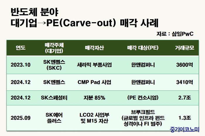 ¡Þ´ë±â¾÷ Carve-out Á᫐ ´ëÇü M&A ÀÕµû¶ó=ÃÖ±Ù ±¹³» ¹ÝµµÃ¼ M&A ½ÃÀå¿¡¼ ¼º»çµÈ ÁÖ¿ä °Å·¡µéÀº ´ëºÎºÐ ´ë±â¾÷ÀÌ ºñÇÙ½É ¶Ç´Â Áߺ¹ »ç¾÷À» ºÐ¸®ÇØ ¸Å°¢ÇÏ´Â ¡®Carve-out¡¯ ¹æ½ÄÀ¸·Î ÀÌ·ïÁ³´Ù. ƯÈ÷ SK±×·ìÀº ¹Ì·¡ ¼ºÀ嵿·Â È®º¸¿Í À繫±¸Á¶ °³¼±À» À§ÇØ Æ÷Æ®Æú¸®¿À ÀçÆí Àü·«À» º»°ÝÈÇÏ¸ç ±½Á÷ÇÑ ÀÚ»ê ¸Å°¢À» ¿¬À̾î ÁøÇàÇß´Ù.