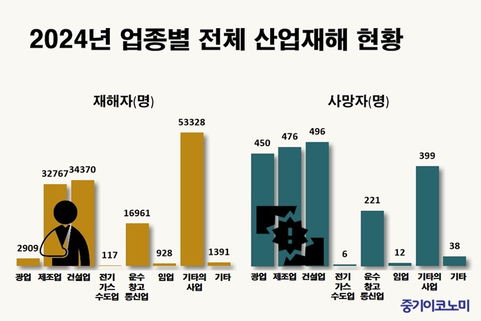 ¡ÞÁß¼Ò»ç¾÷À塤°Ç¼³¡¤Á¦Á¶¾÷¿¡ ÁýÁß=±è ±³¼ö¿¡ µû¸£¸é, 2024³â »ê¾÷ÀçÇØ »ç¸ÁÀÚ´Â 2098¸íÀ¸·Î Áý°èµÆ´Ù. °Ç¼³¾÷ 496¸í, Á¦Á¶¾÷ 476¸íÀ¸·Î ÀÌµé ¾÷Á¾¿¡¼ Àý¹Ý¿¡ ´ÞÇϸç, ´ëºÎºÐÀÌ 50ÀÎ ¹Ì¸¸ »ç¾÷Àå¿¡¼ ¹ß»ýÇϰí ÀÖ´Ù. ±è ±³¼ö´Â ¡°SPC °è¿ °øÀåÀÇ ³¢ÀÓ »ç°íó·³ ¼³ºñ ¹®Á¦º¸´Ù ¾ÈÀü°ü¸®ÀÚ ºÎÁ·°ú 1ÀÎ ÀÛ¾÷ °üÇà µî ÀÎÀû¿ä¼Ò°¡ ´õ Å« ¹®Á¦¡±¶ó¸ç, »ç°í ¿øÀÎÀÇ ±¸Á¶Àû ¼º°ÝÀ» ÁöÀûÇß´Ù.