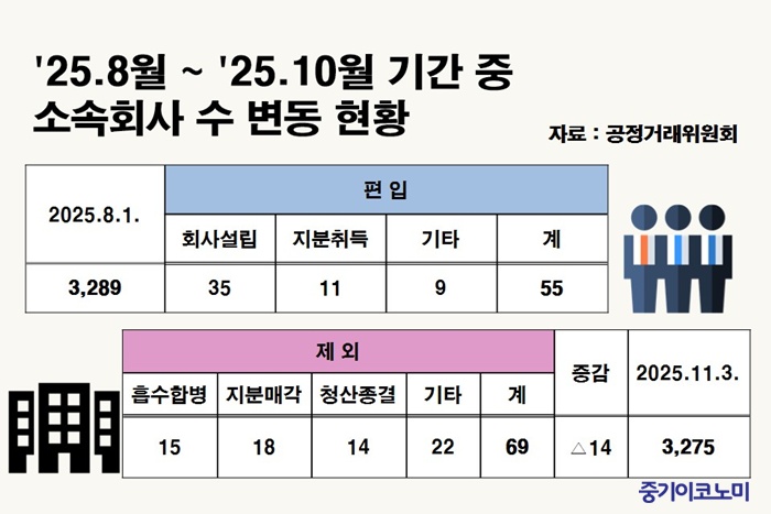°øÁ¤°Å·¡À§¿øÈ¸´Â 21ÀÏ 2025³â 8¿ùºÎÅÍ 10¿ù±îÁö ´ë±Ô¸ð±â¾÷Áý´Ü(ÀÚ»ê 5Á¶¿ø ÀÌ»ó)ÀÇ ¼Ò¼Óȸ»ç º¯µ¿ ÇöȲÀ» °ø°³Çß´Ù. 92°³ Áý´ÜÀÇ ¼Ò¼Óȸ»ç´Â 8¿ù 1ÀÏ ±âÁØ 3289°³¿¡¼ 11¿ù 3ÀÏ 3275°³·Î 14°³ ÁÙ¾ú´Ù. ÀÌ ±â°£ ¼Ò¼Óȸ»ç º¯µ¿ÀÌ ¹ß»ýÇÑ ±â¾÷Áý´ÜÀº 48°³·Î Áý°èµÆ´Ù.