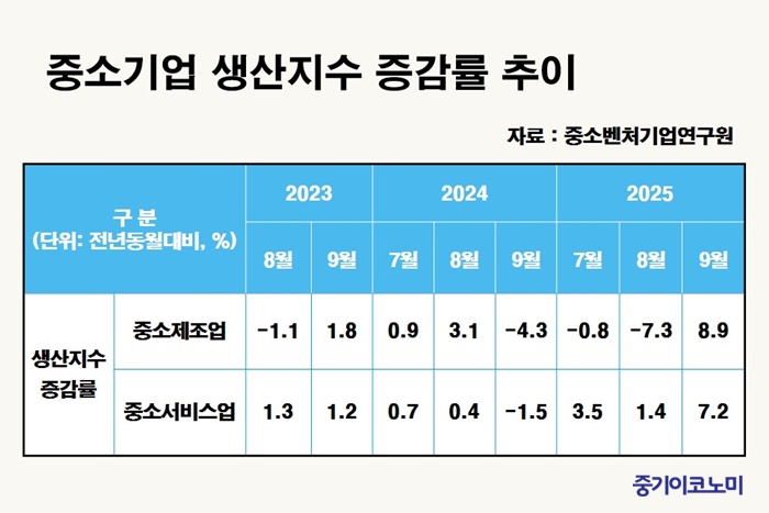 Áß¼Òº¥Ã³±â¾÷¿¬±¸¿øÀÌ ÃÖ±Ù ¹ßÇ¥ÇÑ ¡®KOSI Áß¼Ò±â¾÷ µ¿Çâ 2025³â 11¿ùÈ£¡¯¿¡ µû¸£¸é, Áö³ 9¿ù Áß¼ÒÁ¦Á¶¾÷ »ý»êÀº Ãß¼® ¿¬ÈÞ ½ÃÁ¡ Â÷ÀÌ¿¡ µû¸¥ Á¶¾÷Àϼö Áõ°¡¿Í ¹ÝµµÃ¼¡¤ÀÚµ¿Â÷ µî ÁÖ·Â ¾÷Á¾ÀÇ »ý»ê È®´ë¿¡ ÈûÀÔ¾î Àü³â µ¿¿ù ´ëºñ 8.9% Áõ°¡Çß´Ù. Áß¼Ò¼ºñ½º¾÷ »ý»ê ¿ª½Ã ¹Î»ýȸº¹ ¼ÒºñÄíÆù µî ¼Òºñ ÁøÀÛ Á¤Ã¥ÀÇ È¿°ú·Î µµ¡¤¼Ò¸Å¾÷ µî¿¡¼ ½ÇÀûÀÌ ´Ã¸ç 7.2% Áõ°¡ÇÑ °ÍÀ¸·Î ³ªÅ¸³µ´Ù.