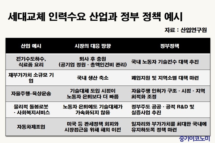 ƯÈ÷ ÇâÈÄ 5³â°£ »ê¾÷º°·Î ¡®¼¼´ë±³Ã¼ Àη¼ö¿ä¡¯°¡ ÁýÁßÀûÀ¸·Î ¹ß»ýÇÏ´Â ºÐ¾ß°¡ µå·¯³ª°í ÀÖ´Ù°í Çß´Ù. ³²¼º ³ëµ¿ÀÚÀÇ °æ¿ì ¿î¼Û¡¤¼³ºñ¡¤Á¤Á¦¾÷, Á¦Á¶¾÷ ±â¼úÁ÷ µî¿¡¼ °í·ÉÃþ ºñÁßÀÌ ³ô¾Æ ´ë±Ô¸ð ÀºÅð°¡ ¿¹»óµÇ°í, ¿©¼ºÀº »çȸº¹Áö¡¤ÀǷᡤ±³À° µî ¼ºñ½º ºÐ¾ß¿¡¼ ¼¼´ë±³Ã¼ ¾Ð·ÂÀÌ »ó´ëÀûÀ¸·Î Å©´Ù´Â °ÍÀÌ´Ù.