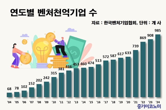 Áß¼Òº¥Ã³±â¾÷ºÎ¿Í º¥Ã³±â¾÷Çùȸ°¡ ÃÖ±Ù ¹ßÇ¥ÇÑ ¡®2024 º¥Ã³Ãµ¾ï±â¾÷ Á¶»ç¡¯¿¡ µû¸£¸é, 2024³â °á»ê±âÁØ ¸ÅÃâ 1000¾ï¿øÀ» ³Ñ±ä º¥Ã³Ãµ¾ï±â¾÷Àº ÃÑ 985°³»ç·Î Áý°èµÆ´Ù. ÀÌ´Â Àü³âº¸´Ù 77°³»ç°¡ ´Ã¾î³ °ÍÀ¸·Î Áõ°¡À²Àº 8.5%¿¡ À̸¥´Ù.