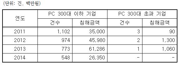 PC 300´ë ÀÌÇÏ ±â¾÷ÀÇ ÀúÀÛ±Ç Ä§ÇØ°Ç¼ö´Â 2011³â 1102°Ç¿¡¼ 2012³â 974°Ç, 2013³â 773°ÇÀ¸·Î Á¡Â÷ °¨¼ÒÇÏ´Â Ãß¼¼´Ù. ¹Ý´ë·Î Ä§ÇØ±Ý¾×Àº 2012³â 350¾ï¿ø¿¡¼ 2012³â 459¾ï8000¸¸¿ø, 2013³â 612¾ï8600¸¸¿øÀ¸·Î Áõ°¡Çϰí ÀÖ´Ù.