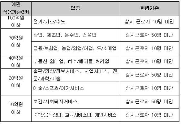 °³Æí¾ÈÀÌ È®Á¤µÇ¸é ÇöÇà ¾÷Á¾º°·Î »ó½Ã±Ù·ÎÀÚ ¼ö¸¦ ±âÁØÀ¸·Î 50¸í ¹Ì¸¸(Á¦Á¶¾÷, °Ç¼³¾÷, ¿î¼ö¾÷ µî), 10¸í ¹Ì¸¸(±âŸ ¼ºñ½º¾÷Á¾ µî)À¸·Î °¢°¢ ´Þ¸® Àû¿ëµÇ´ø ±âÁØÀÌ ¾÷Á¾º°·Î 3³â°£ Æò±Õ¸ÅÃâ¾× ±Ô¸ð¿¡ µû¶ó 5°³ ±×·ìÀ¸·Î ³ª´¶´Ù. ¼Ò±â¾÷ÀÇ ¸ÅÃâ¾× ±âÁØÀº ¡ã100¾ï¿ø ÀÌÇÏ ¡ã70¾ï¿ø ÀÌÇÏ ¡ã40¾ï¿ø ÀÌÇÏ ¡ã20¾ï¿ø ÀÌÇÏ ¡ã10¾ï¿ø ÀÌÇÏ·Î ºÐ·ùµÈ´Ù. À̰°Àº ¾ÈÀº Áß±â¾÷°ú ¸¶Âù°¡Áö·Î ¼Ò±â¾÷ÀÌ Á¤Ã¥Áö¿øÀ» À§ÇØ °í¿ëÀ» ±âÇÇÇÏ´Â Çö»óÀ» ÇØ°áÇϱâ À§ÇØ ÃßÁøµÆ´Ù´Â °ÍÀÌ Áß±âûÀÇ ¼³¸íÀÌ´Ù.